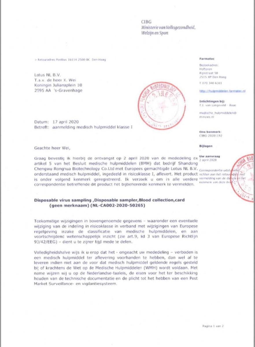 我公司新冠病毒檢測(cè)采樣試劑盒完成CIBG荷蘭注冊(cè)